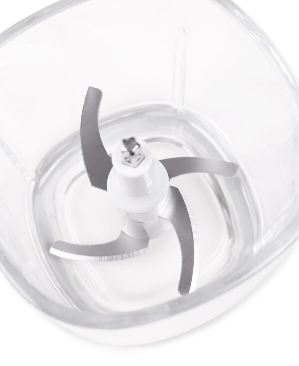 Med sin 800 ml glasbehållare (full kapacitet) och dubbla rostfria SUS-blad med specialskydd klarar den enkelt att hacka, mixa och vispa allt från grönsaker till nötter. Den matt svarta designen med dekorativ rostfri stålkant gör att den smälter in i alla kök.