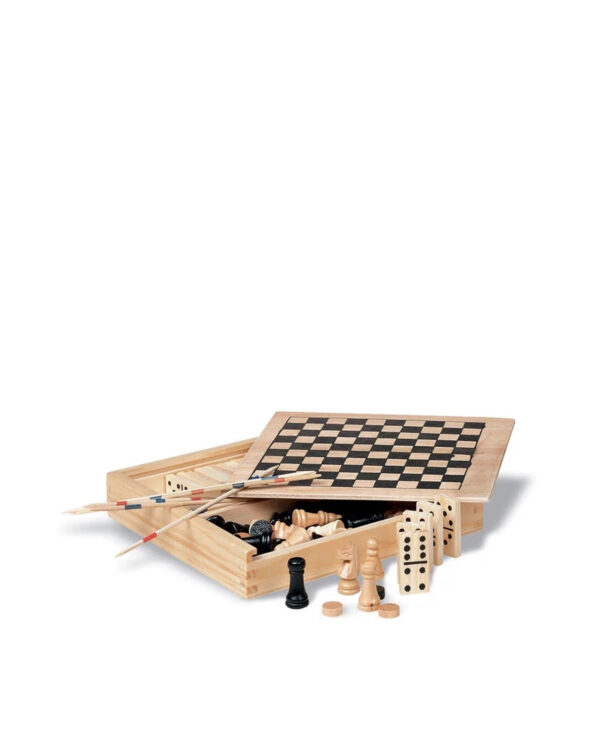 4 i 1 spel, bestående av domino, schack, ''drafts'' och plockepinn.